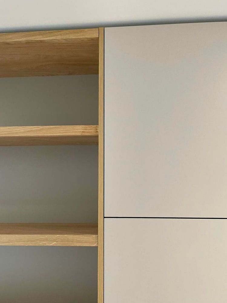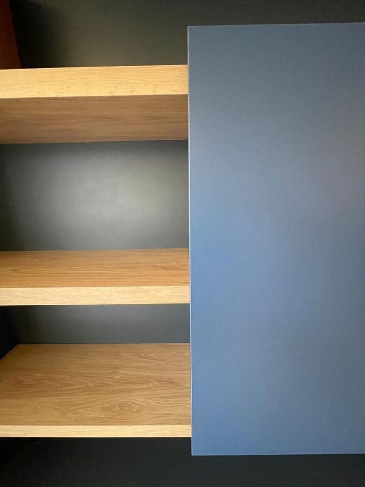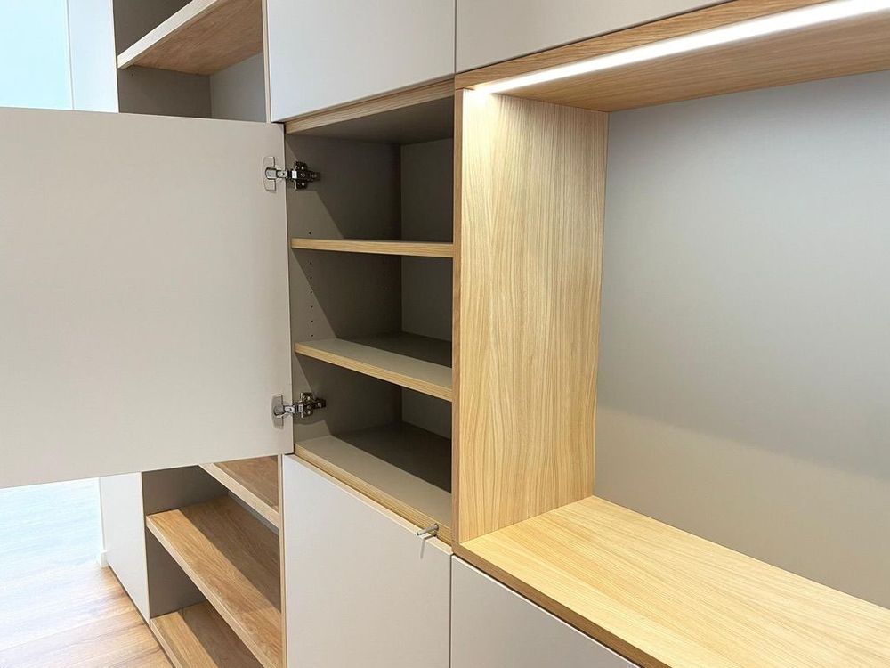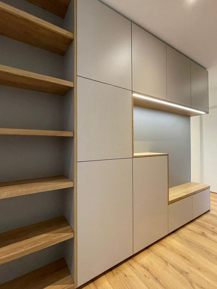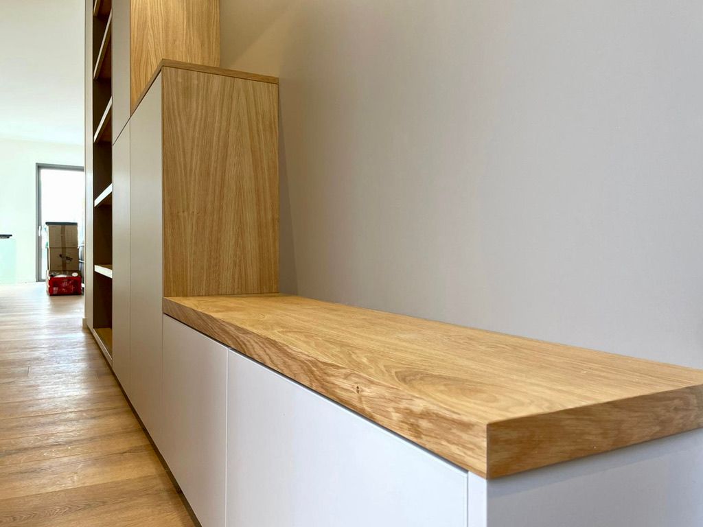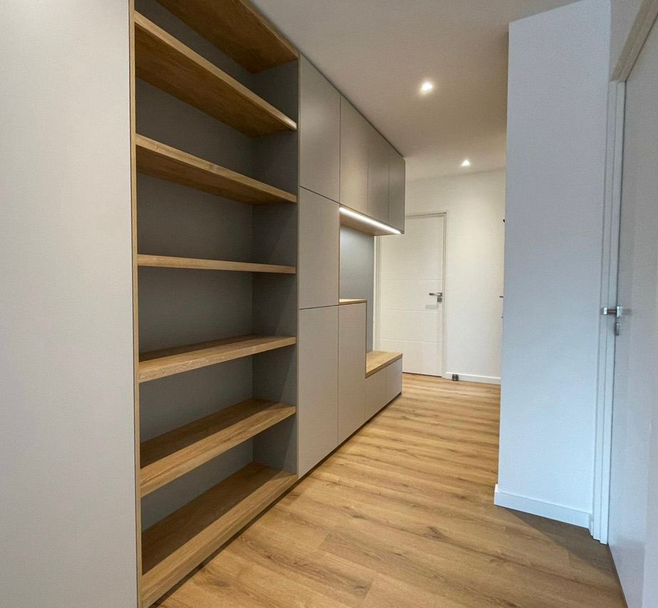 Projet d’agencement pour une maison à Meylan comprenant la réalisation d’un linéaire d’entrée sur-mesure et d’un ensemble bibliothèque / meuble TV dans le séjour.
