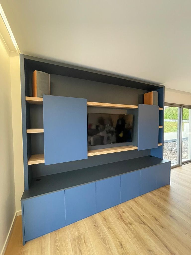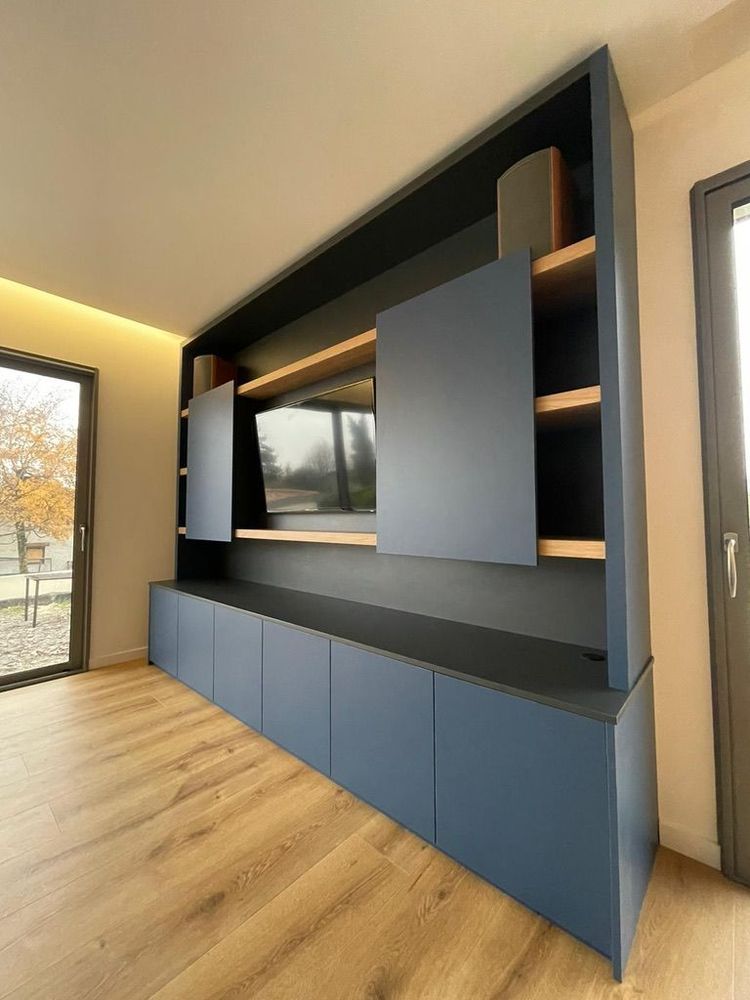 Dans le salon, la bibliothèque et le meuble TV jouent une partition plus contemporaine. Les portes coulissantes amorties permettent de masquer la télévision et le système hifi, avec un passage de câbles totalement invisible pour une esthétique épurée.