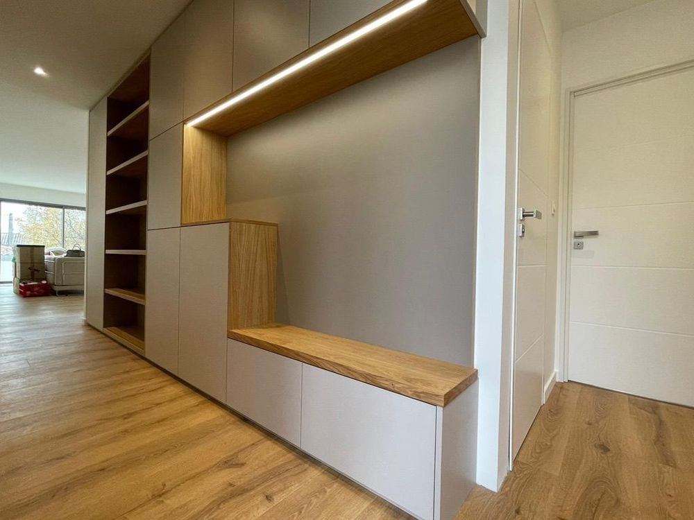 L’entrée a été pensée comme un espace structurant et chaleureux, combinant banc, tiroirs à chaussures, penderie et éclairage intégré.