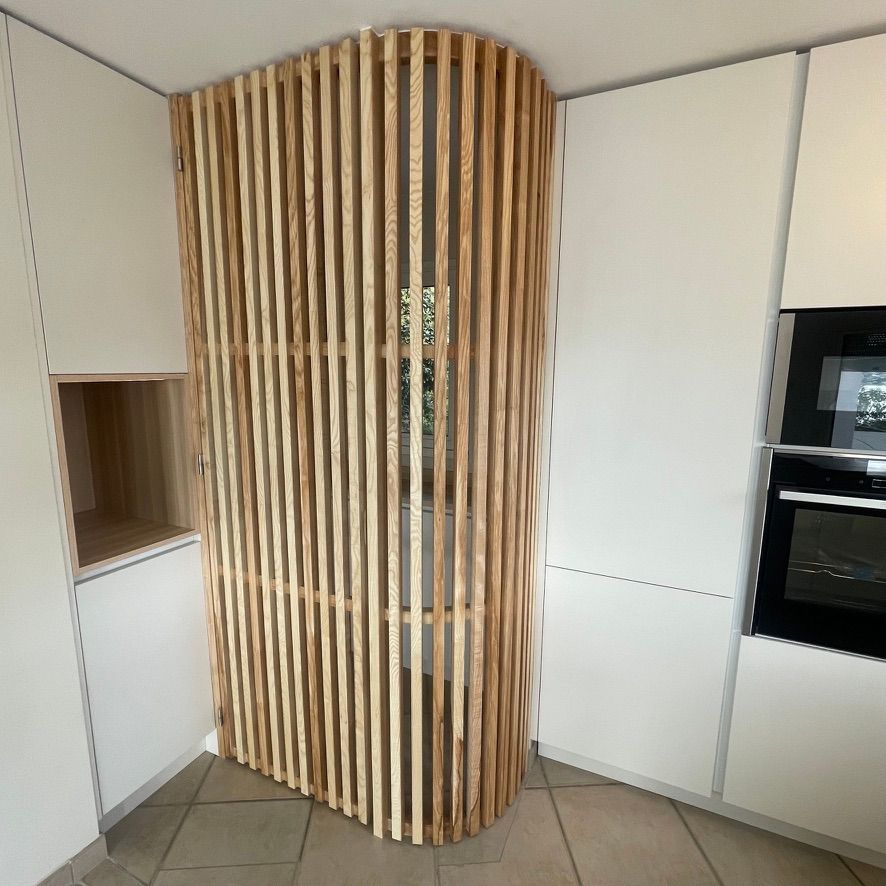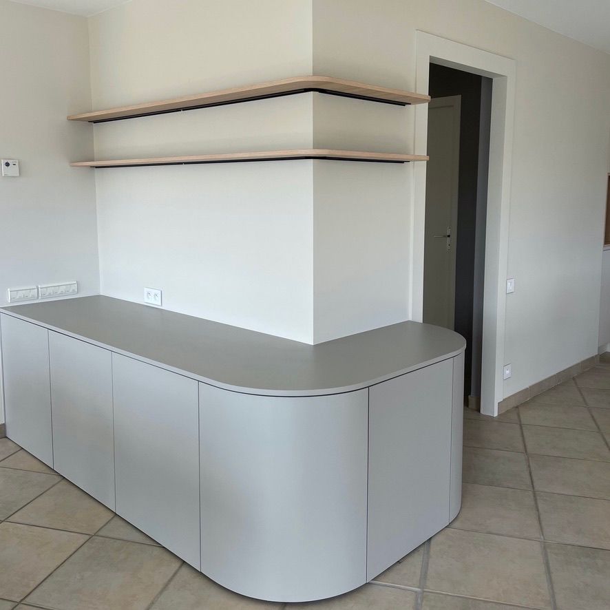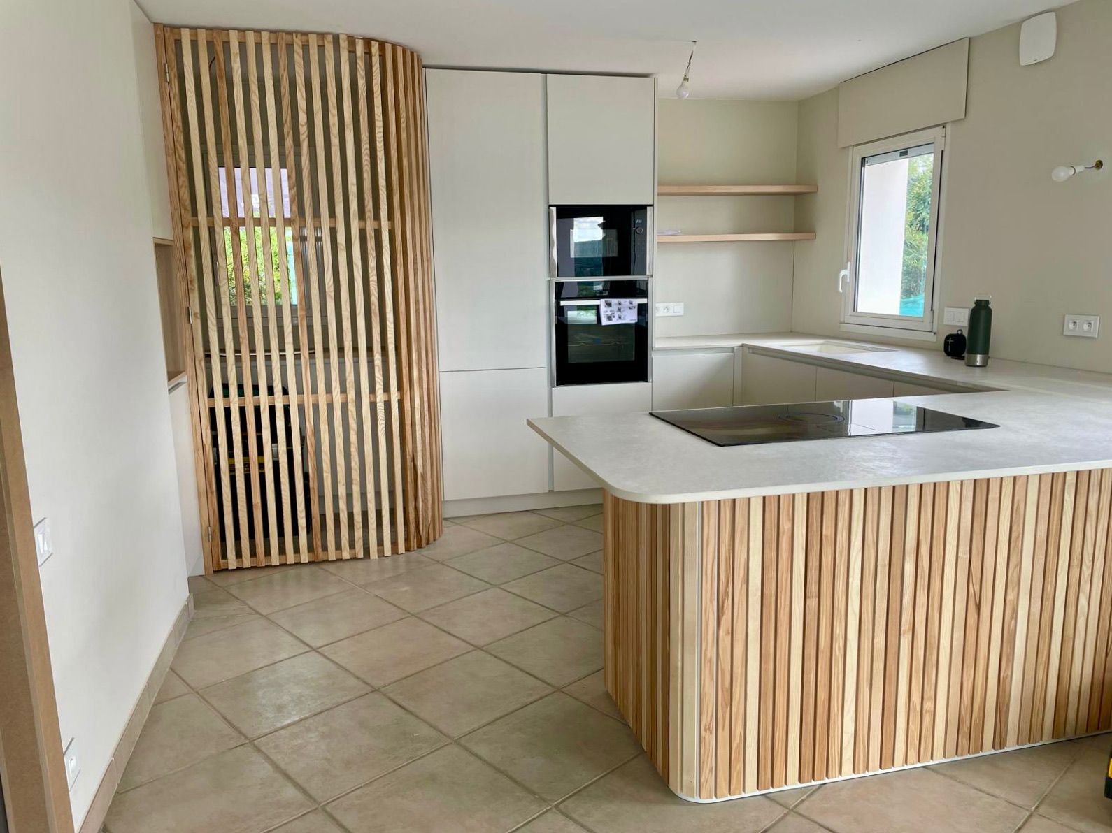 La cuisine se distingue par une séparation murale courbe et un habillage d’îlot en frêne massif, apportant fluidité et caractère architectural à l’espace.