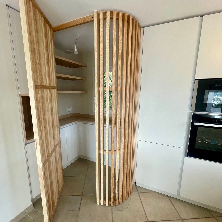 Le projet associe un blanc porcelaine élégant à la chaleur du frêne scandinave, créant une atmosphère douce et épurée.