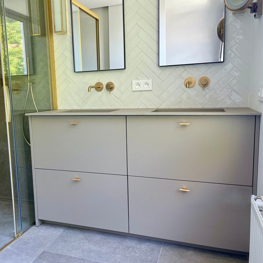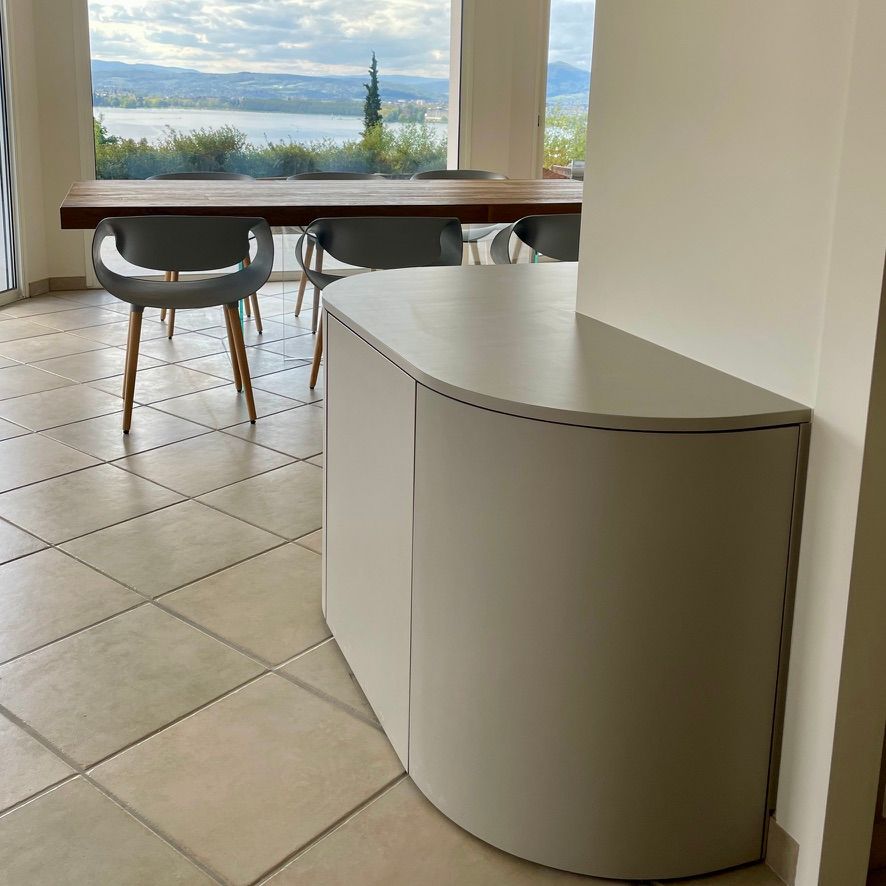 Pour cette maison située à Veyrier-du-Lac, les clients souhaitaient un aménagement sur mesure à la fois lumineux, naturel et contemporain, intégrant la cuisine, la salle de bain et un meuble salon.