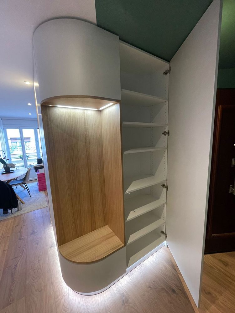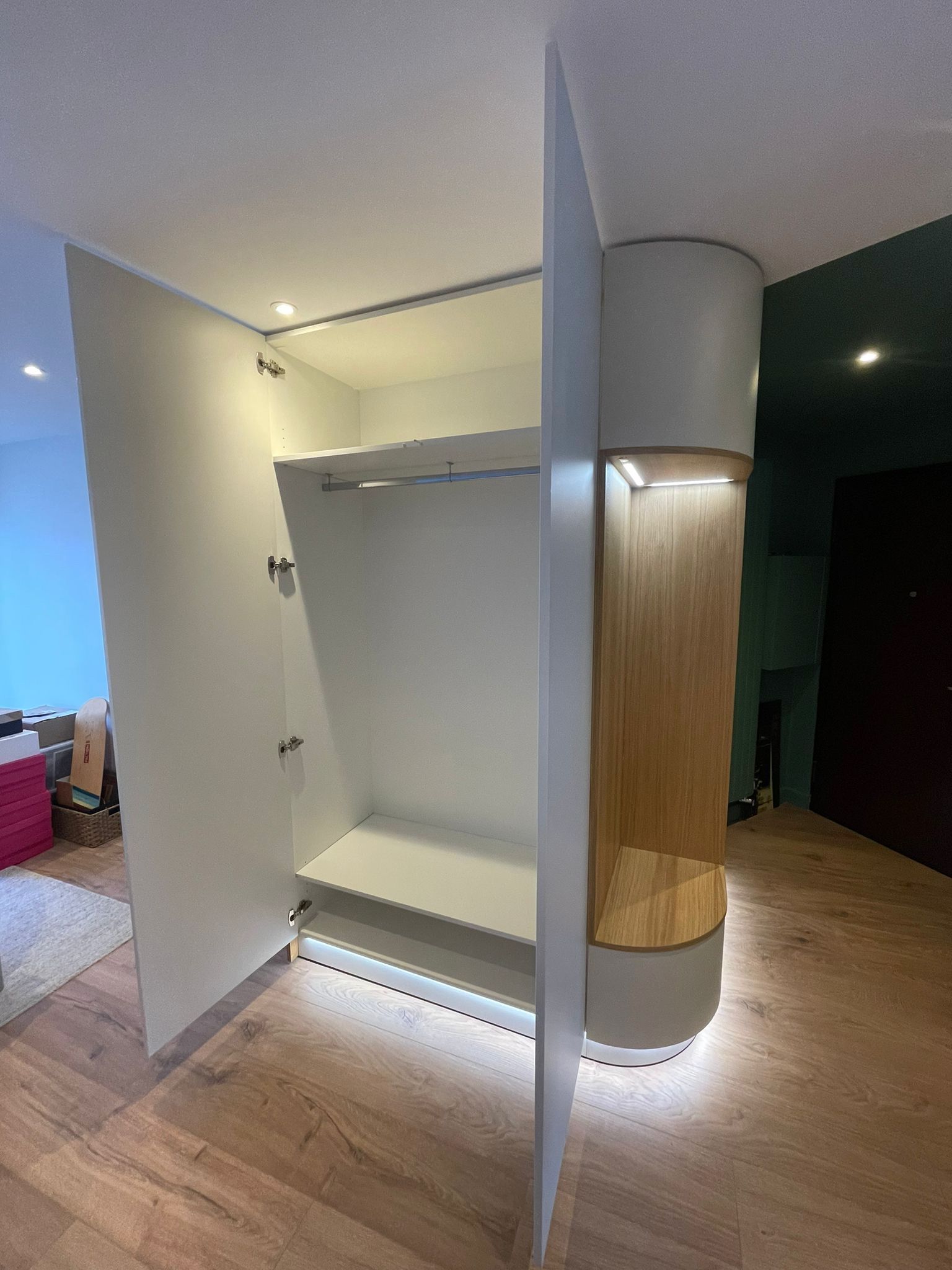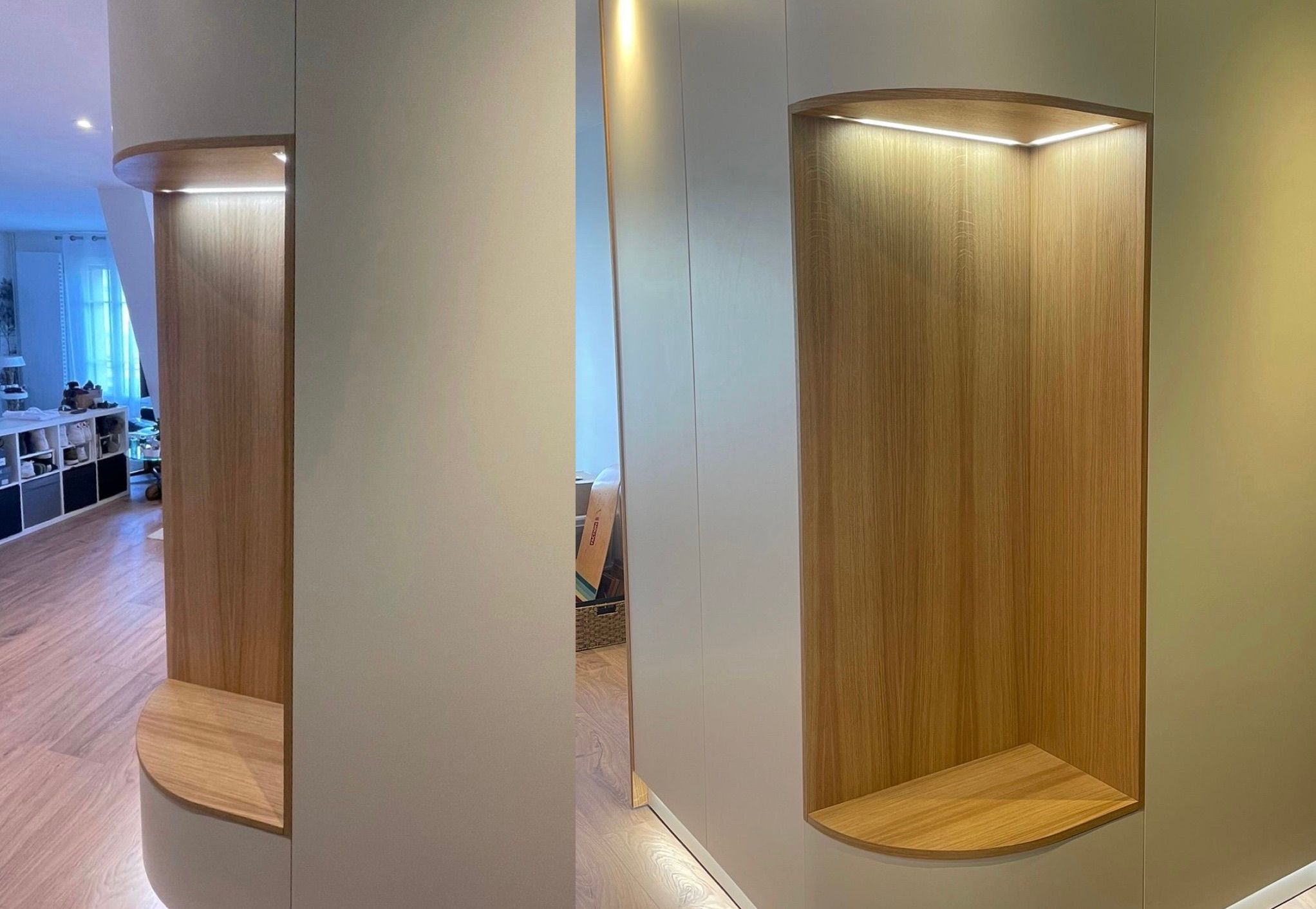 Réalisation d’un meuble d’entrée sur-mesure aux lignes courbes, pensé comme un élément architectural et d’optimisation de la circulation.