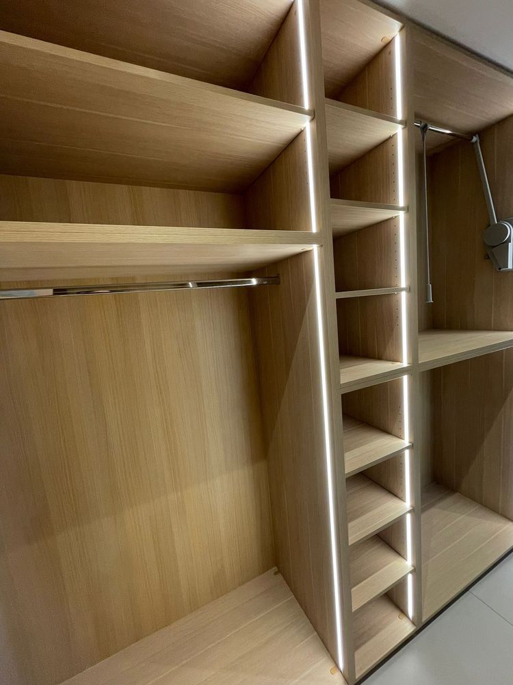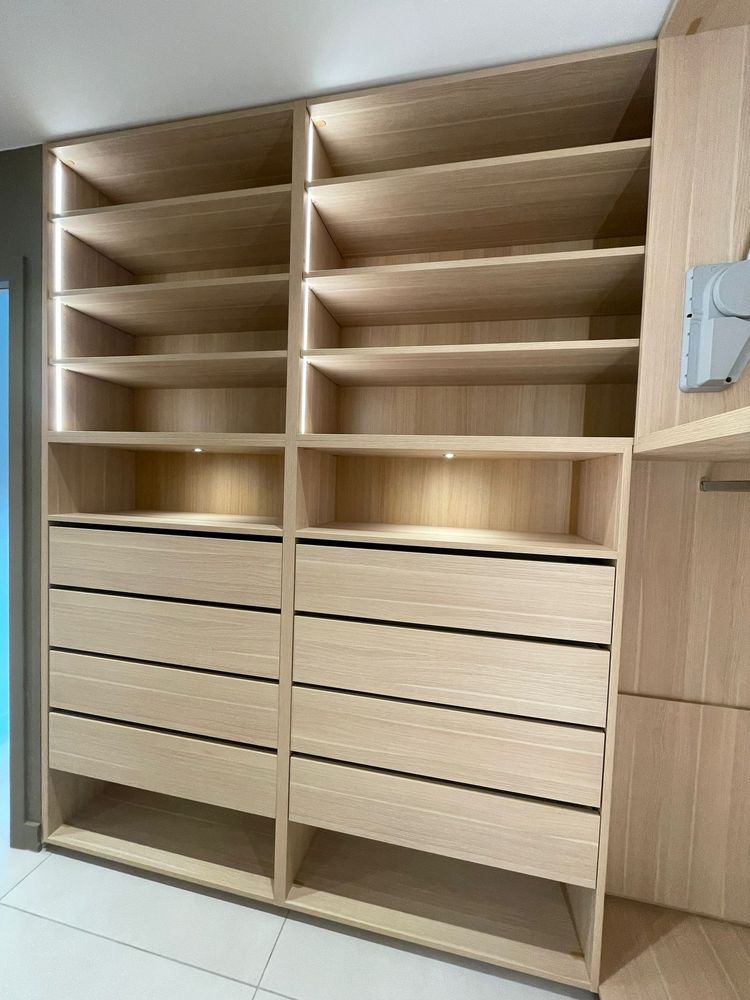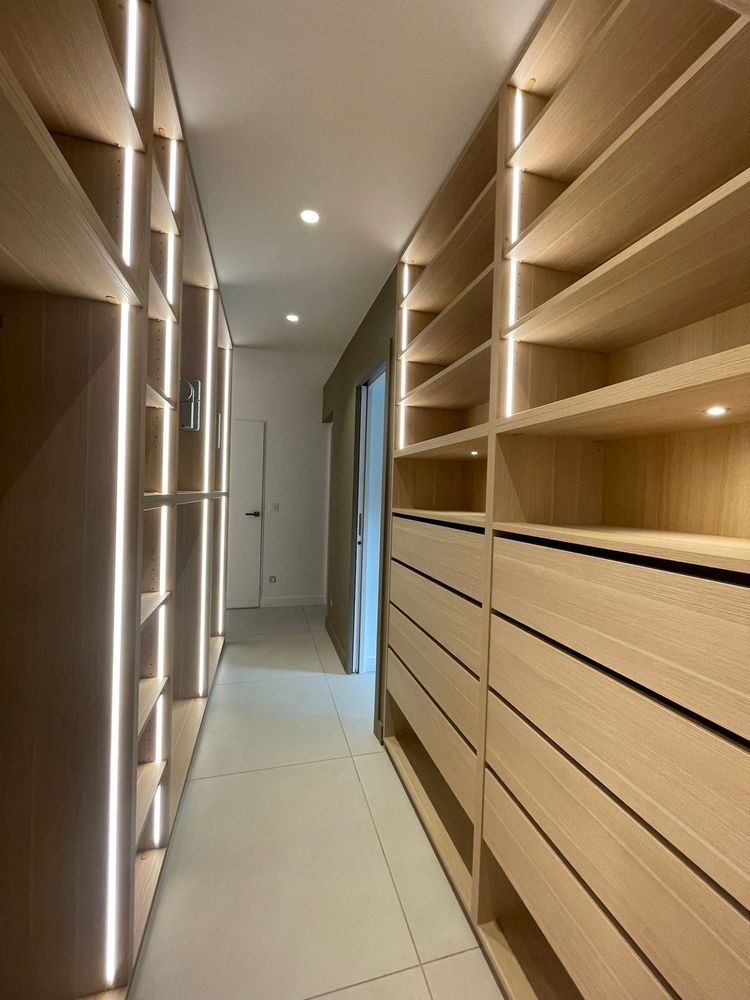 Dessiné par Manon Grégoire, le projet combine rangements astucieux, tiroirs sur-mesure et barres de penderie escamotables, avec un éclairage direct et indirect intégré pour sublimer les volumes et créer une atmosphère chaleureuse et fonctionnelle.