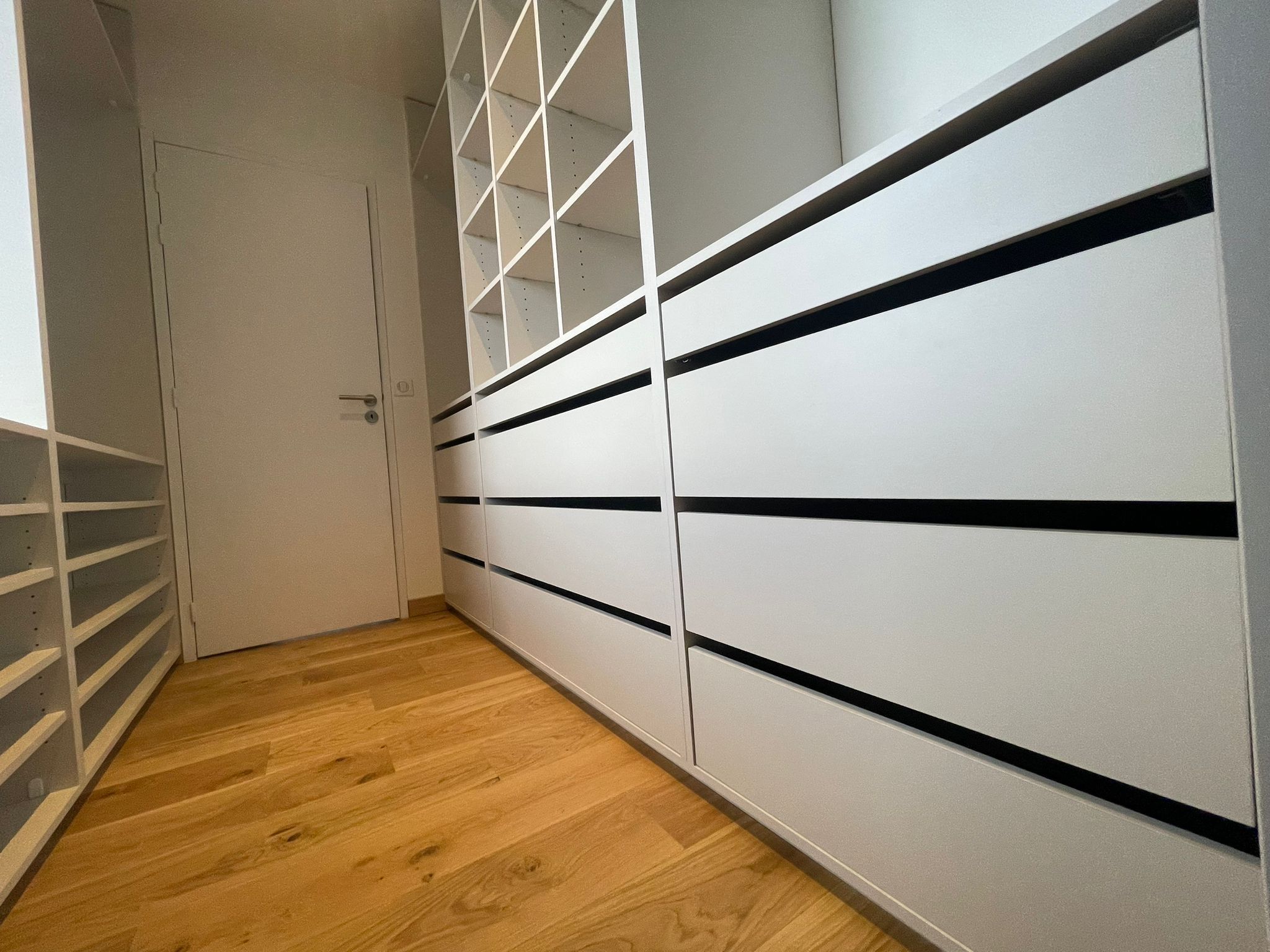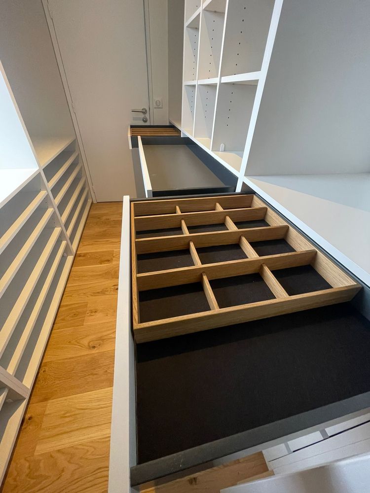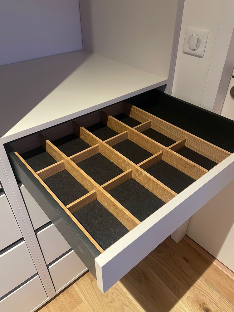 Le sur-mesure a permis d’intégrer des séparateurs en chêne massif dans certains tiroirs spécialement fabriqués pour organiser écharpes, montres et bijoux — chaque accessoire.