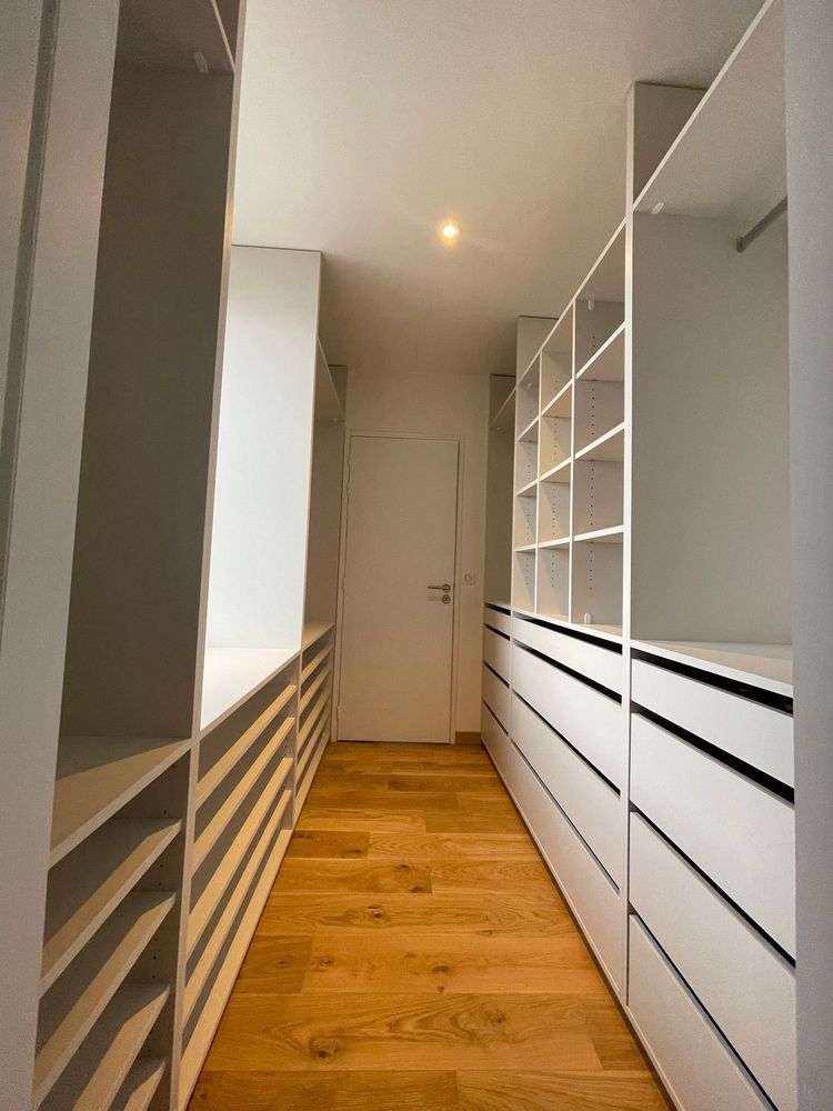Aménagement d’un espace dressing dans une pièce en longueur, avec un objectif clair : optimiser chaque centimètre.
