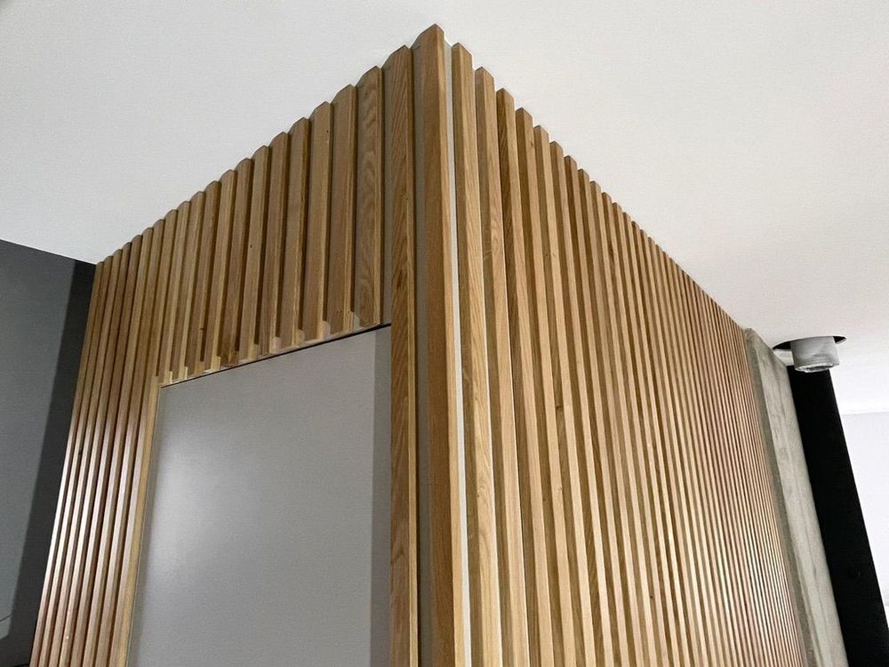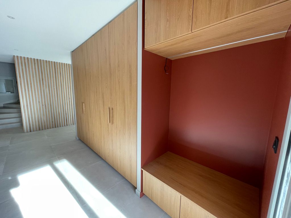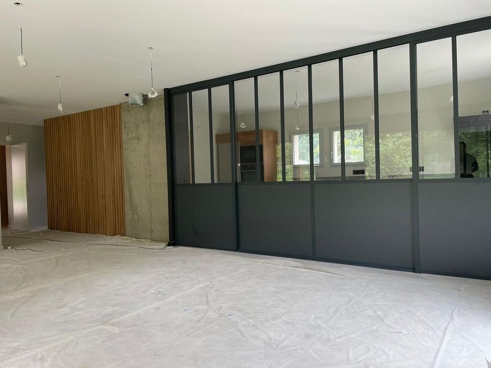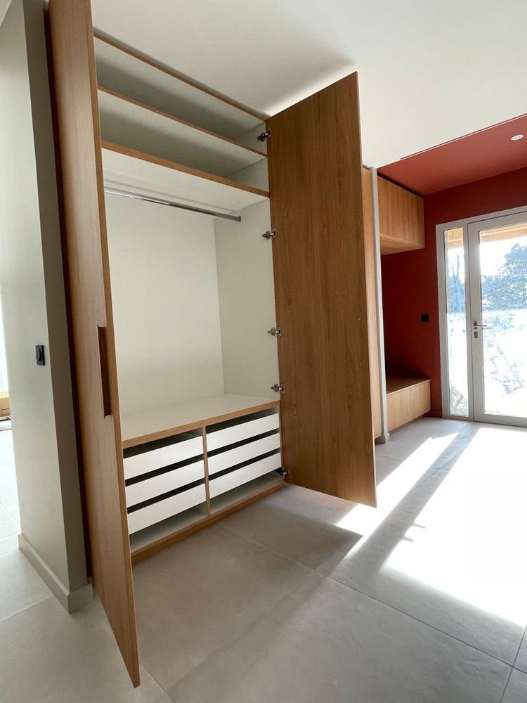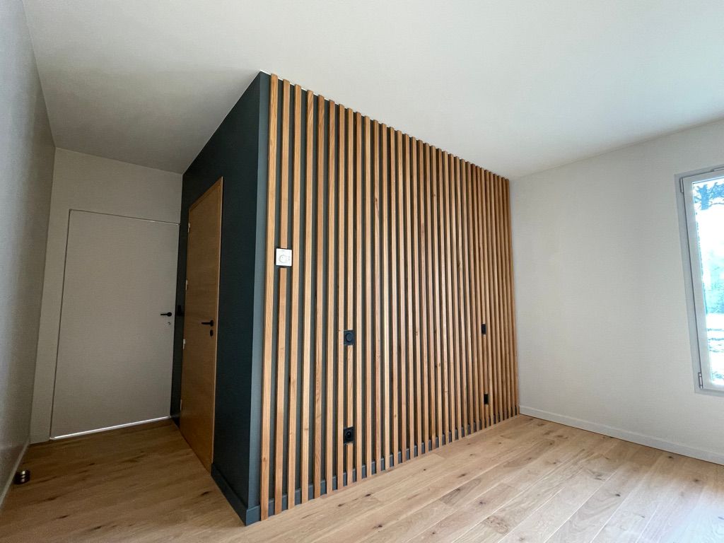 Projet complet d’agencement intérieur comprenant la réalisation de deux meubles de salle de bain sur-mesure, accompagnés d’un dressing, d’une verrière et d’un habillage mural en chêne massif.